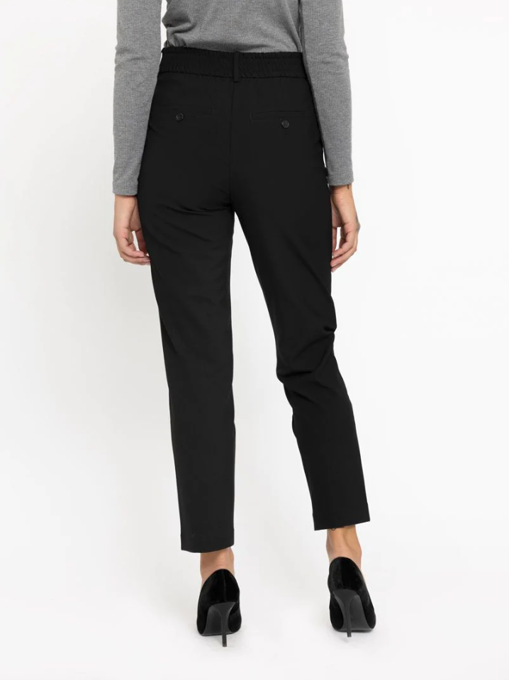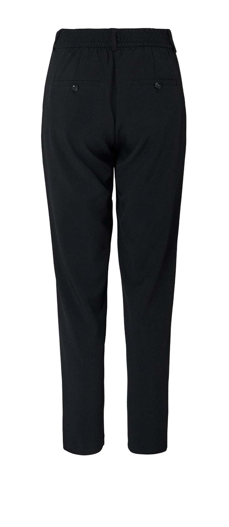 Dressbukse i rett passform med høyt liv og strikk bak i livet for komfort. Lukkes med knapper og gylf, har stikklommer og rette ben. Klassisk og flatterende på.