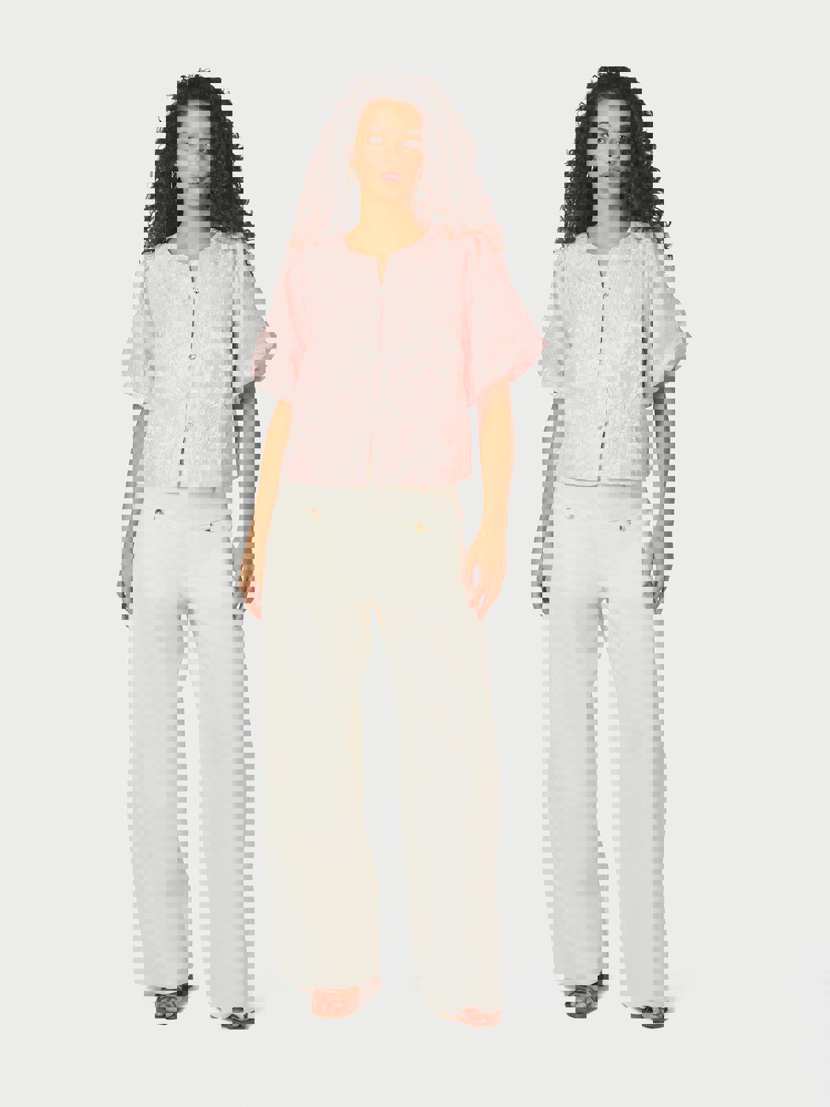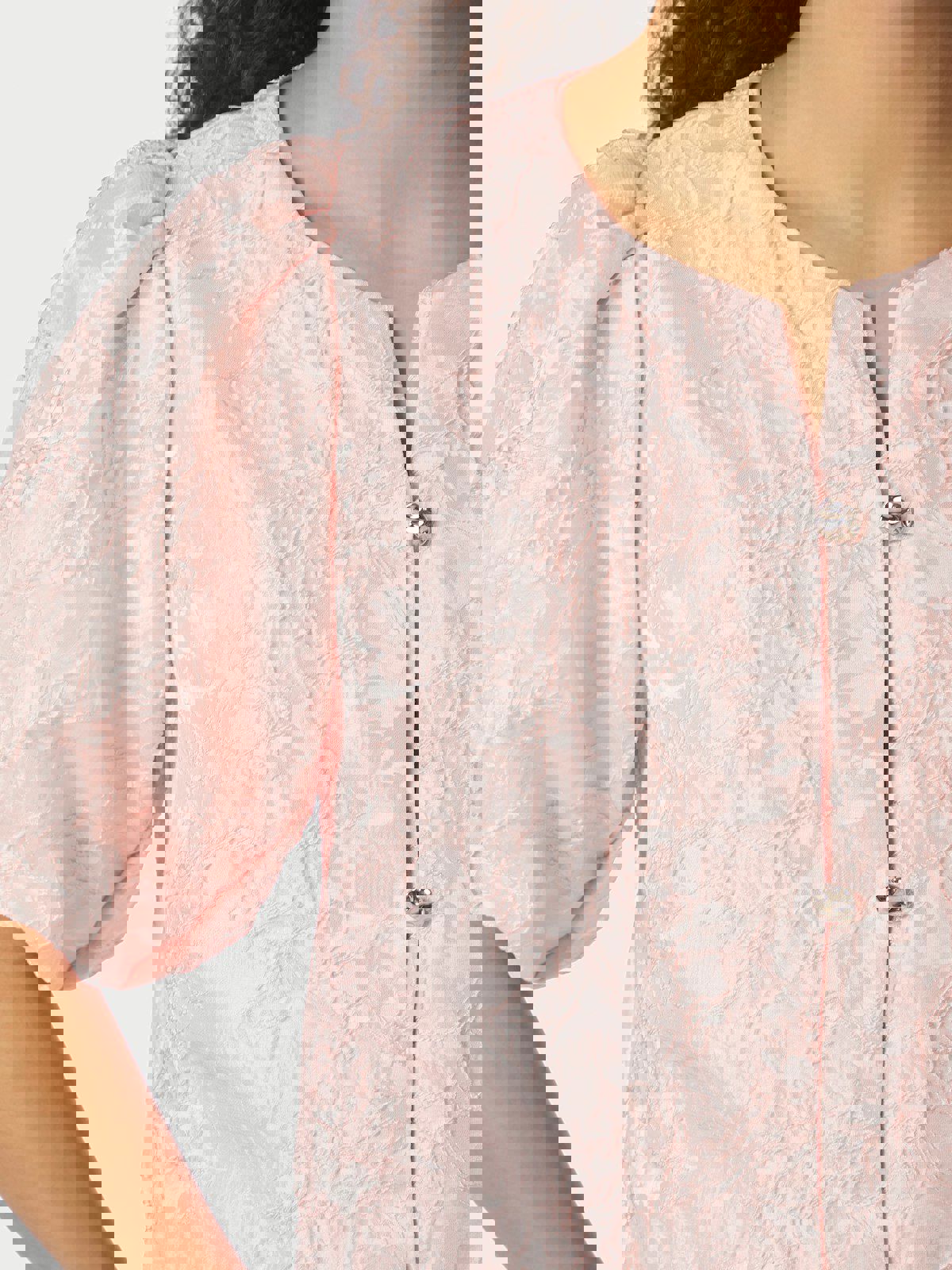 Aisa Soft Brocade Blouse i en delikat lys rosa farge er et elegant valg for enhver anledning. Denne blusen er laget av 100% polyester, noe som gir en myk og behagelig følelse mot huden.