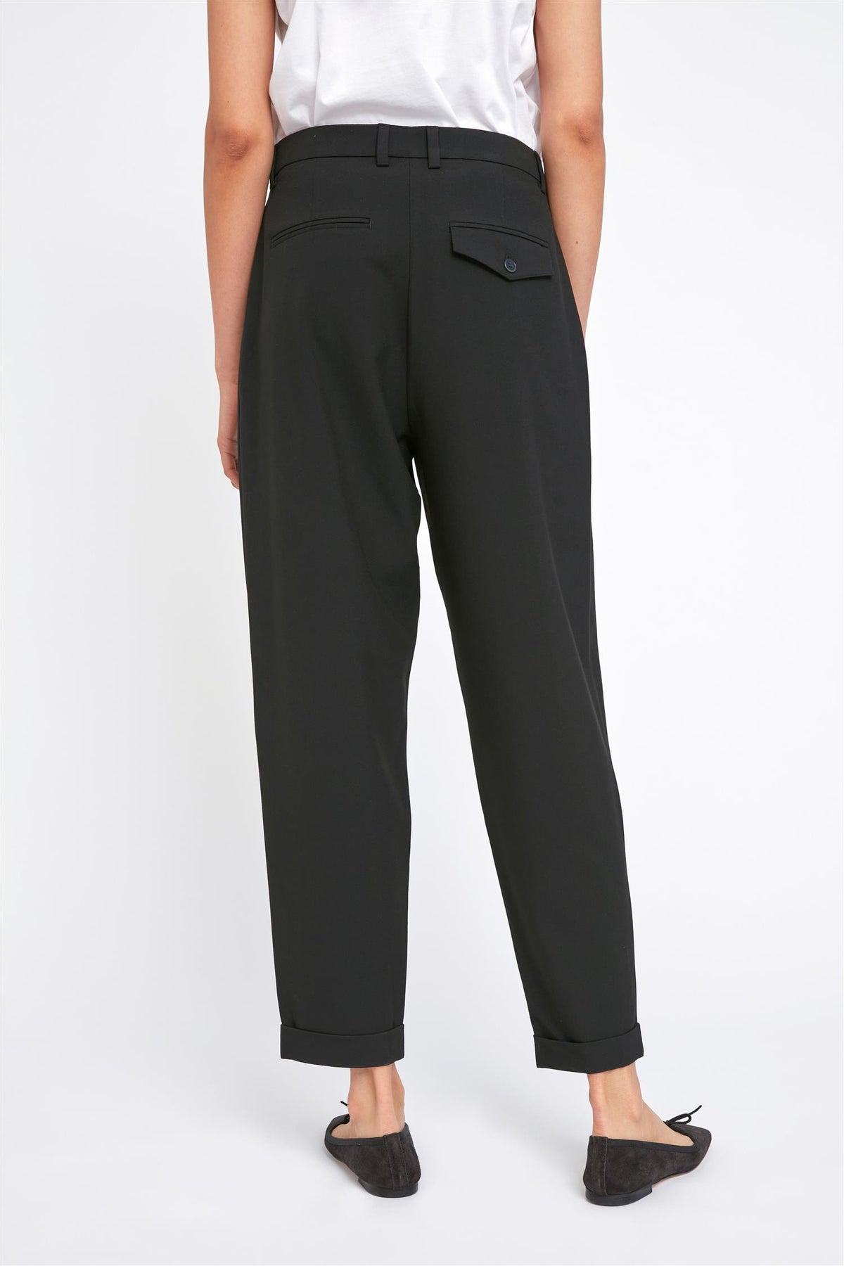 Buksen er designet med høyt liv for å sitte komfortabelt rundt midjen og hoftene, samtidig som den gir et elegant fall i buksebenene. Den er laget av en bærekraftig blanding av 76 % resirkulert polyester, 17 % viskose og 7 % elastan, som gir både komfort og miljøvennlighet.