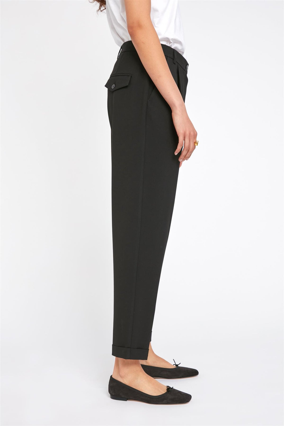 Klassisk dressbukse med vide, rette ankel-korte ben. Buksen er medium høy i livet og har stikklommer i sidene og jukselommer bak. Lukkes med hemper og glidelås. Litt stor på størrelsen.