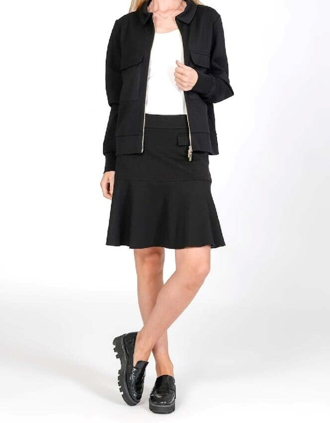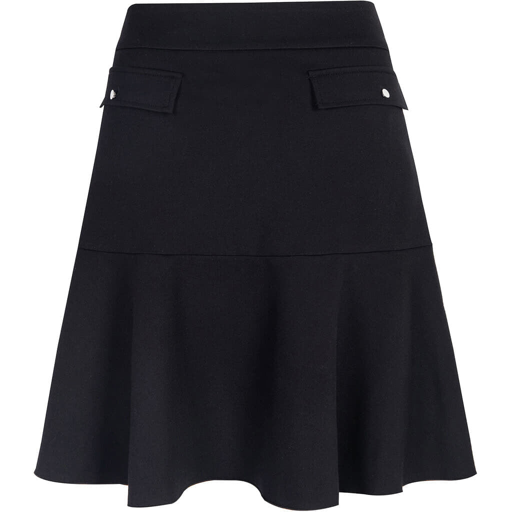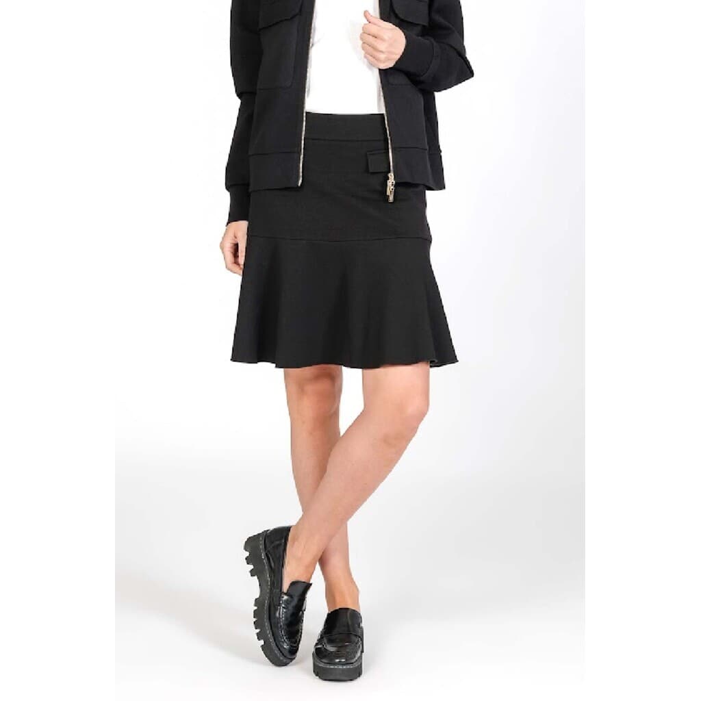 Stilsikkert skjørt i myk, litt tykkere jersey med volanger og dekorative jukselommer med knapper. Lukkes med skjult glidelås. Tettsittende i liv og lang ledig kant gjøre Faye flatterende og enkel å style.